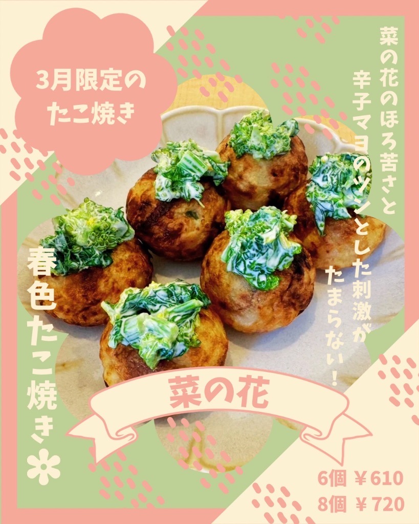 これからも皆様に楽しんでもらえるような美味しい月替わりのたこ焼きや笑顔をお届けし、その他さまざまなメニューも考案中ですので、お楽しみに!