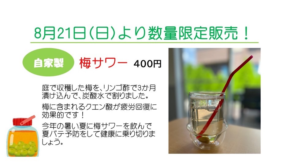 自家製の梅サワー、数量限定のため残り僅かになってきました。