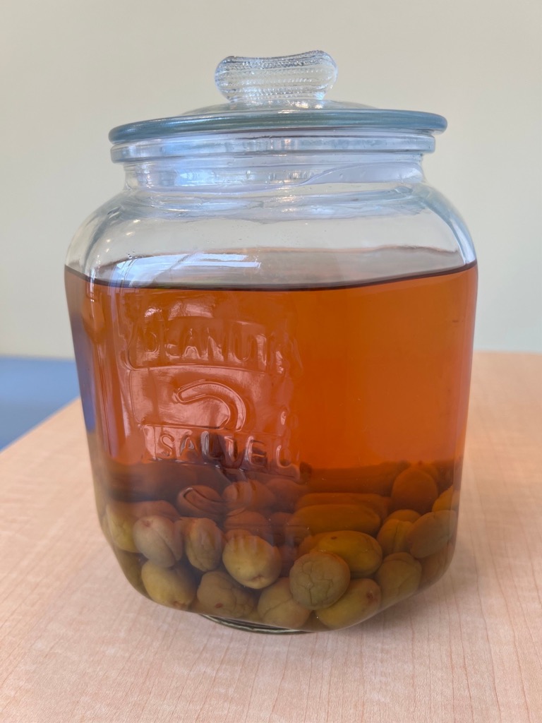 庭で収穫した無農薬の梅をリンゴ酢に3か月漬け込んで炭酸水で割っています。梅に含まれるクエン酸が疲労回復に効果的です。