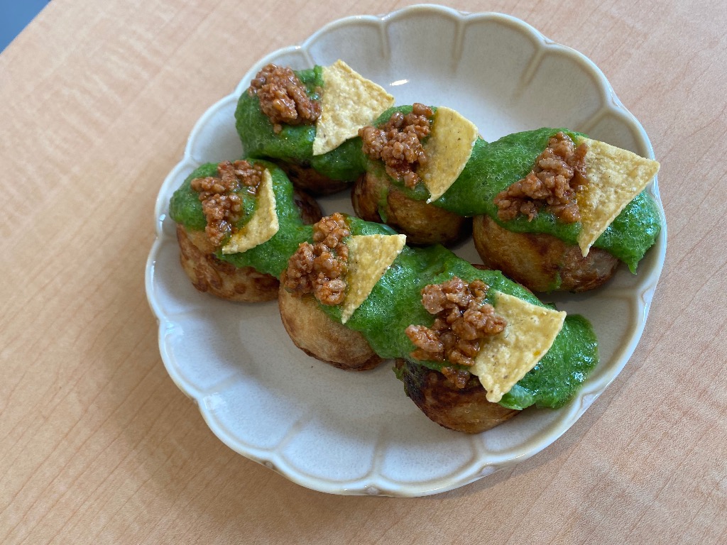 春日井特産のさぼてんをすって、ひき肉とタコスチップをトッピング